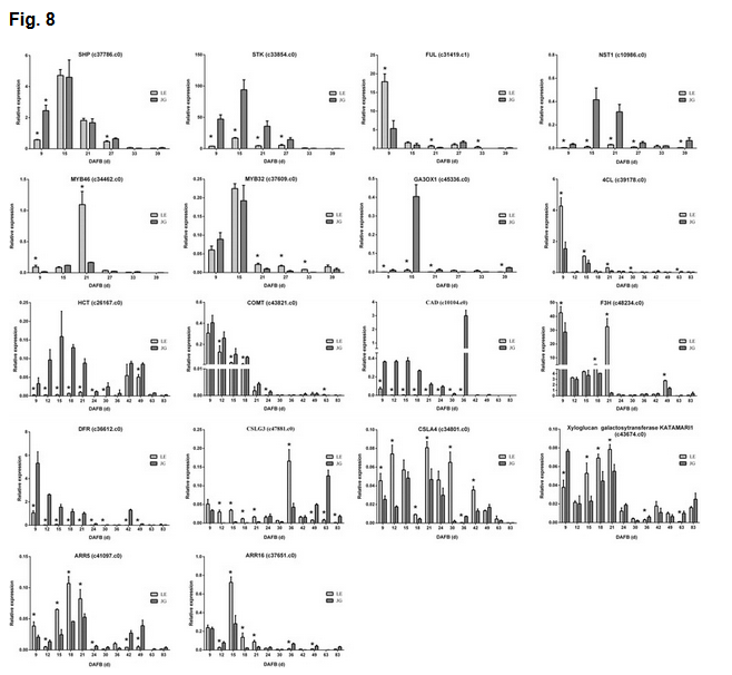 b)一些轉(zhuǎn)錄因子也被報(bào)道與內(nèi)果皮發(fā)育相關(guān),包括SHP 、 STK、ALC、IND、FUL、RPL、NST1、NST3以及一些MYB家族轉(zhuǎn)錄因子。該項(xiàng)目中,SHP, FUL, MYB32 ,STK, MYB46–1, MYB46–2, ?NST1 也包含在兩個(gè)品種間的差異表達(dá)基因列表中,也發(fā)現(xiàn)了上述部分基因差異表達(dá)方向與預(yù)期不符。