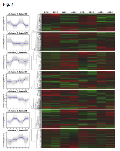 a)文章最后,使用K-means聚類對(duì)之前得到的差異表達(dá)基因進(jìn)行了共表達(dá)分析,分析結(jié)果顯示:基于表達(dá)趨勢(shì),所有差異基因可劃分為7個(gè)cluster,每個(gè)cluster內(nèi)部的基因具有相似的表達(dá)趨勢(shì),也就可能在細(xì)胞內(nèi)行駛著相似的功能,聚類結(jié)果見圖7。 b)之前分析得到的內(nèi)果皮發(fā)育相關(guān)基因大多分布在cluster1或者cluster6,cluster1中的基因在LE品種中高表達(dá),JG品種低表達(dá),cluster6與cluster1相反。