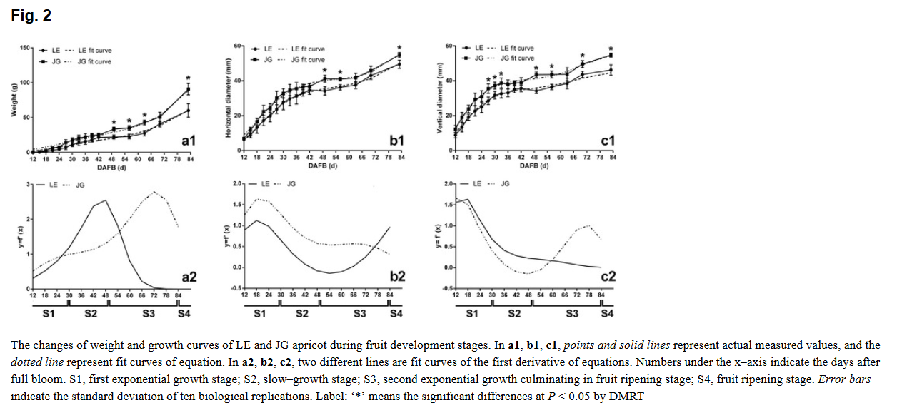 a)如圖2所示,兩種品種杏的果實(shí)具有相似的發(fā)育模式,a1、b1、c1是以開花后時(shí)間(DAFB)為橫坐標(biāo),分別以果實(shí)重量、果實(shí)長(zhǎng)度、果實(shí)寬度為縱坐標(biāo)做圖,兩種杏的果實(shí)均呈現(xiàn)出了“雙S曲線”生長(zhǎng)模式,圖a2、b2、c2是分別對(duì)a1、b1、c1一階導(dǎo)數(shù)作圖,兩種果實(shí)同樣也表現(xiàn)出相似的趨勢(shì)。 根據(jù)生長(zhǎng)曲線,研究者將果實(shí)的發(fā)育劃分為4個(gè)時(shí)期:第一次指數(shù)生長(zhǎng)期(before 30DAFB)、緩慢生長(zhǎng)期(30-49DAFB)、第二次指數(shù)生長(zhǎng)期(49-83DAFB)、成熟期(after 83DAFB)。