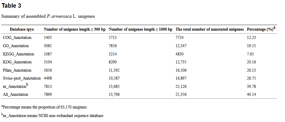 a)基于blast比對(duì),63,170條unigene中有25,356可比對(duì)到日本杏(Japanese apricot)與桃(peach)基因組數(shù)據(jù)庫(kù)。 b)使用BLASTx(e-value閾值設(shè)為10e-5)將上述25,356條unigene比對(duì)到NR, Swiss-Port, GO, COG, KOG ,kegg數(shù)據(jù)庫(kù)以進(jìn)行功能注釋,每條unigene均有多條注釋,詳細(xì)的注釋結(jié)果統(tǒng)計(jì)信息請(qǐng)參見表3. c)GO數(shù)據(jù)庫(kù)注釋過(guò)程中,16,506條unigene被注釋到,其中, ‘metabolic process’ (8408 genes, 50.93%)是被注釋到最多的GO 條目;KEGG數(shù)據(jù)庫(kù)注釋過(guò)程中,4830條unigene被注釋到了118個(gè)代謝通路。大部分的unigene被注釋到了‘carbohydrate metabolism’ (905 genes), ‘translation’ (596 genes), ‘a(chǎn)mino acid metabolism’ (581 genes), or ‘folding, sorting and degradation’ (471 genes)等代謝通路。