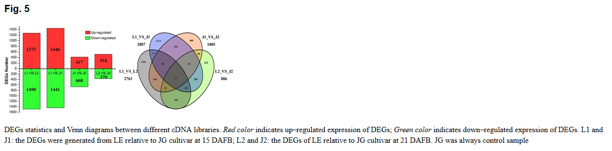 使用DESeq進(jìn)行了差異表達(dá)基因檢測(cè),差異表達(dá)基因篩選閾值為:FDR<0.01,F(xiàn)C > 2 。15DAFB時(shí)間點(diǎn)上,兩個(gè)品種間檢測(cè)到差異表達(dá)基因2887個(gè),24DAFB時(shí)間點(diǎn)上,兩個(gè)品種間檢測(cè)到差異表達(dá)基因886個(gè),具體上下調(diào)、共有特有情況請(qǐng)參見圖5.