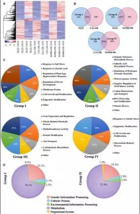 a)為了分析XL22抗旱表型后的基因調控網絡,研究者分別對XL22、 CA1-OE、SAPK6-OE 3個轉化株系在正常給水與相同缺水處理條件下的材料進行了轉錄組測序,取樣部位為倒二葉,每個處理設置兩個生物重復,測序使用illumina Hiseq平臺,PE150讀取方式,數據分析在百邁客云計算平臺(m.homeprohandy.com)完成。