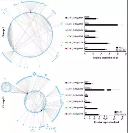 d)為了揭示GroupI 、Group2兩個基因集內部的基因調控關系,研究者基于STRING數據庫分別繪制了上述兩個基因集內部基因的蛋白互作網絡圖。如圖7所示,GroupI蛋白互作網絡中包含481個PPI(protein-protein intereaction,PPI),Group2中包含280個PPI。其中,有6個基因在蛋白互作網絡中均處于非常中心的位置(與之互作蛋白數量越多,越靠近中心位置)。其中,3個(LOC_Os12g13720, ?LOC_Os03g58800, ?LOC_Os09g31486) 在兩個蛋白互作網絡中均處于中心位置,分別編碼 PDR ABC transporter, a ATPase, and a DnaK/Hsp70s family protein,可能在干旱應答過調控網絡發(fā)揮著非常關鍵的;其他3個基因(Group1特異:LOC_Os04g42260 ?LOC_Os02g38580,Group2特異:LOC_Os05g03050)分別編碼protein phosphatase、Rad51、Hsp90 ,從功能可以看出,它們與水稻干旱應答同樣相關。