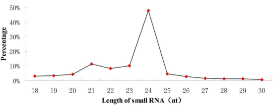從提取的總RNA中構(gòu)建smallRNA文庫(kù),測(cè)序質(zhì)控后得到19,567,691條clean reads,與數(shù)據(jù)庫(kù)比對(duì)發(fā)現(xiàn)有18.83%的rRNA,1.23%的tRNA,0.01%的small nuclear RNA,0.07%的重復(fù)序列,其中79.85%的序列沒(méi)有功能注釋,可以將這些沒(méi)有功能注釋的序列用來(lái)做下一步的miRNA的預(yù)測(cè)和鑒定。根據(jù)smallRNA的測(cè)序長(zhǎng)度分布圖可以得出,miRNA的長(zhǎng)的主要分布在20-25nt之間,豐度最高的是24nt(47.89%)。這個(gè)長(zhǎng)度分布和其他栽培茶以及其他植物報(bào)道的結(jié)果非常相似。