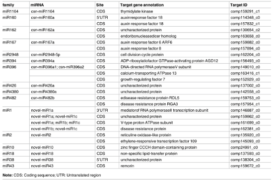 表1.通過(guò)降解組測(cè)序鑒定茶樹(shù)1005中miRNA靶向基因