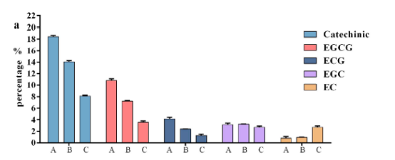 對(duì)茶樹(shù)1005葉片兒茶素含量的研究發(fā)現(xiàn),兒茶素在不同葉片中的的含量由高到低排序?yàn)椋旱谝蝗~,芽,第二葉,第三葉,成熟葉。第一葉,第三葉和成熟葉的兒茶素含量有顯著差異。