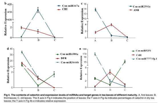 為了更好的了解兒茶素生物合成過(guò)程中miRNA與目標(biāo)基因之間的表達(dá)模式以及相互作用,研究人員將不同葉片中兒茶素生物合成相關(guān)基因和miRNA表達(dá)量進(jìn)行分析,并且與兒茶素含量變化的模式相比較。結(jié)果顯示,ANR和C4H有相似的表達(dá)模式,ANR在第三葉中表達(dá)量最高,它與EC,EGC和兒茶素含量沒(méi)有明顯的關(guān)系,在綠茶Shuchazao中有過(guò)類似的報(bào)道。CHI和DFR的表達(dá)量與兒茶素的含量成正相關(guān)的趨勢(shì),這與之前的報(bào)道一致。經(jīng)分析發(fā)現(xiàn),大多數(shù)的miRNA表達(dá)模式與目標(biāo)基因呈相反的趨勢(shì)??傊?,miRNA和目標(biāo)mRNA之間的表達(dá)模式和斷裂位點(diǎn)的負(fù)相關(guān)性是兒茶素生物合成中目標(biāo)miRNA靶向調(diào)控mRNA的有力證據(jù)。