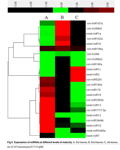 為了探索茶葉中miRNAs與兒茶素合成相關(guān)性,研究人員采用qRT-PCR的方法分析第一葉、第三葉以及成熟葉中miRNA(read values高于平均值)表達(dá)。通過(guò)表達(dá)模式的成簇分析將這些miRNA分成三組。第一組,miRNA表達(dá)模式與兒茶素含量成正相關(guān),分別有novel-miR10, novel-miR13, novel-miR19, csn-miR165a, csn-miR170, csn-miR2593e 和novel-miR12;第二組,miRNA表達(dá)模式與兒茶素含量成負(fù)相關(guān),分別有novel-miR1, novel-miR2, csn-miR160a, csn-miR162a, csn-miR394 和csn-miR396a;第三組,miRNA表達(dá)模式與兒茶素含量沒(méi)有顯著相關(guān)性,有csn-miR4380a。