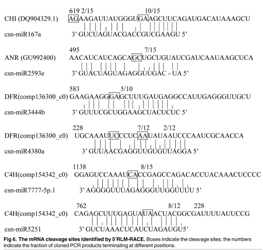 為了深入了解miRNA在調(diào)控兒茶素合成代謝中的功能,研究人員將高通量測(cè)序獲得的miRNA跟NCBI數(shù)據(jù)庫(kù)以及RNA測(cè)序的兒茶素生物合成相關(guān)基因的mRNA進(jìn)行BLAST,預(yù)測(cè)可能的miRNA。為了消除假陽(yáng)性,對(duì)預(yù)測(cè)的斷裂位點(diǎn)進(jìn)行實(shí)驗(yàn)驗(yàn)證。通過(guò)5’-RLM-RACE實(shí)驗(yàn)驗(yàn)證了6個(gè)可能參與兒茶素生物合成功能基因表達(dá)調(diào)控的miRNA。它們分別是csn-miRNA167a、f csn-miR2593e、csn-miR4380a 、csn-miR3444b 、csn-miR5251 和csn-miR7777-5p.1。