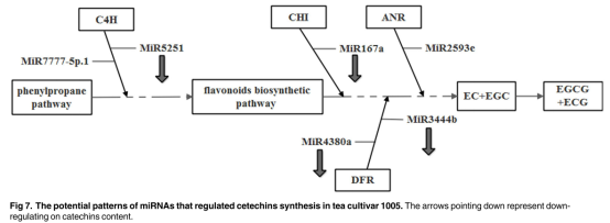 茶樹(shù)(Camellia sinensis),富含兒茶素,是風(fēng)靡全球的非酒精飲料之一。兒茶素是茶葉中重要的組成部分,包括脂型兒茶素(如:ECG和EGCG)和非脂型兒茶素(如:EC和EGC)。EGCG是茶葉中含量最豐富的兒茶素并且具有較強(qiáng)的抗癌效果,可以制約癌細(xì)胞的生長(zhǎng),抑制雄激素受體的功能并調(diào)控癌細(xì)胞的生存,血管的生成和移動(dòng)?;谒麄兊姆肿訕?gòu)成,兒茶素可以分為簡(jiǎn)單兒茶素和脂型兒茶素。在兒茶素的合成過(guò)程中有許多酶的參與,如查耳酮合酶(CHS),查爾酮異構(gòu)酶(CHI),黃烷酮醇4-還原酶(DFR),花青素合酶(ANS),花青素還原酶(ANR)和類黃酮3,5羥基化酶(F3’5’H)。MiRNA被鑒定為轉(zhuǎn)錄和轉(zhuǎn)錄后水平基因表達(dá)的重要調(diào)節(jié)因子,并且裂解目標(biāo)mRNA是植物中基因表達(dá)的主要調(diào)控方式。