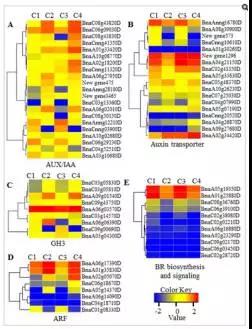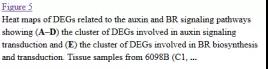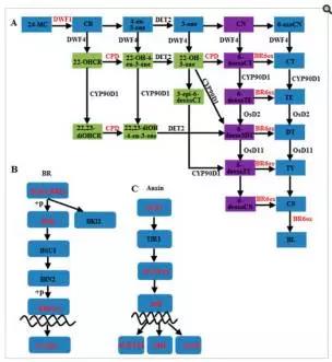 e)圖4展示了在BR生物合成、BR信號轉(zhuǎn)導(dǎo)通路、auxin信號轉(zhuǎn)導(dǎo)通路上鑒定到的差異表達(dá)基因。這些差異基因中,BR6OX調(diào)控了BR生物合成過程中multiple C-6C的氧化過程;DWRF1催化24-methylenecholesterol轉(zhuǎn)化為campesterol,該過程為BR生物合成的第一步;分布在BR信號轉(zhuǎn)導(dǎo)通路上的差異基因包括 BRI1, BSK, BZR1, and CYCD3等, 這些基因多在品系 Purler中下調(diào) (見圖 5E);分布在 auxin 信號轉(zhuǎn)導(dǎo)通路上的基因包括 AUX1, IAA, GH3, ARF等,其中 IAAs, GH3s, ?ARFs 在兩個時間點(diǎn)的 Purler品系材料中均表現(xiàn)為上調(diào)。