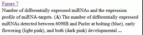 c) IDEG6軟件分析( |FC| >2)進(jìn)行差異表達(dá)分析,兩個時間點(diǎn)在兩個品系間分別檢測得到45、65個差異表達(dá)microRNA。值得注意的是,如圖7所示,除了miR1140 與miR827, 抽薹時間點(diǎn)上的所有已知 差異表達(dá)miRNAs 均在 品系Purler中上調(diào),這其中包括3個miR156 家族 與6個 miR395 家族microRNA,相反,花發(fā)育早期時間點(diǎn)上的所有差異表達(dá)miRNAs 均在 品系Purler中下調(diào)。