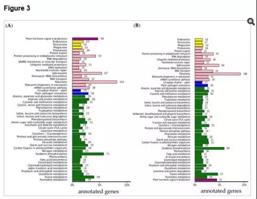 d)對兩個時間點(diǎn)所有差異基因進(jìn)行KEGG通路分析,其中3297個基因注釋到了KEGG數(shù)據(jù)庫 ,其中大多數(shù)基因注釋到了 ribosome 、oxidative phosphorylation相關(guān)代謝通路。值得注意的是,在兩個時間點(diǎn)分別有58、51個差異基因注釋到了植物激素信號通路,進(jìn)一步分析發(fā)現(xiàn),這些通路大多為BR或auxin信號轉(zhuǎn)導(dǎo)通路。該部分結(jié)果如圖3所示。