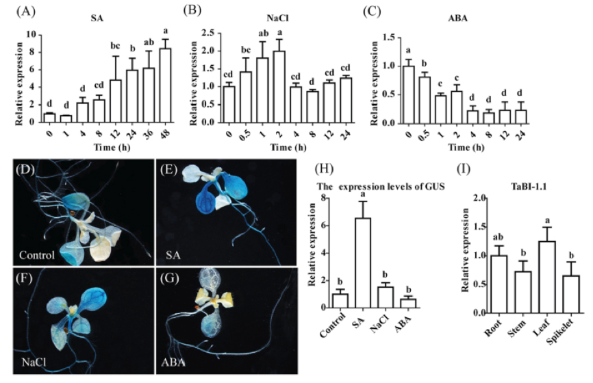 研究者創(chuàng)建了含有1.7kb TaBI-1.1啟動子并生成轉(zhuǎn)基因擬南芥的PBI :: GUS融合構(gòu)建體,以研究TaBI-1.1的空間表達模式。使用GUS染色測定組織GUS活性。在成熟葉和根中有TaBI-1.1表達,但在下胚軸和幼葉中觀察不到(圖1D)。還檢測了各種小麥組織中的TaBI-1.1表達水平,包括根,莖,葉和小穗,結(jié)果表明TaBI-1.1的表達在這些小麥組織中普遍存在,而且在葉中最高,在小穗中最低(圖1I)。在SA和NaCl處理之后,成熟葉中的表達與對照相比增加,并且SA處理的表達更高。當(dāng)SA和NaCl處理時,在下胚軸中也檢測到表達(圖1E,F(xiàn))。在ABA處理的植物的葉子中檢測到較弱的表達(圖1G)。通過qRT-PCR進一步證實GUS表達水平(圖1H)。以上結(jié)果表明,TaBI-1.1在各種脅迫下均有表達。