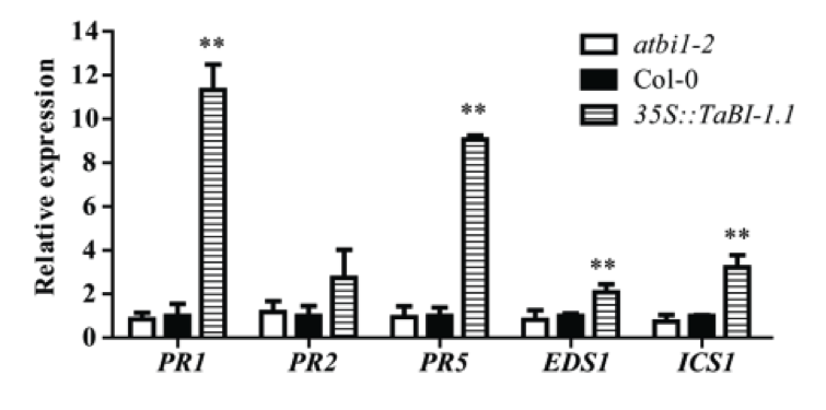 圖3. 通過qRT-PCR檢測正常條件下生長的atbi1-2,Col-0和35S :: TaB1-1.1 2周齡幼苗中5個SA相關(guān)基因的表達水平。