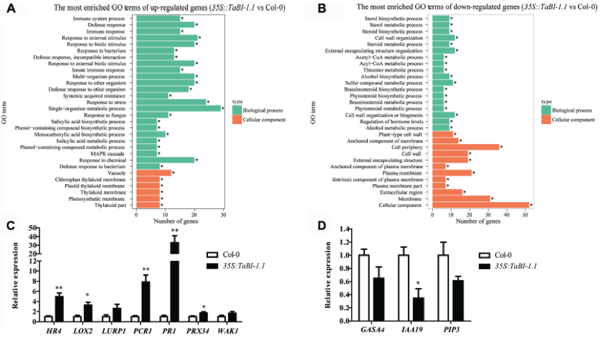 研究人員對35S :: TaBI-1.1#1和Col-0植物進行了RNA-seq分析,以更好地理解TaBI-1.1功能。鑒定出48個上調(diào)基因和58個下調(diào)基因并做了一個熱圖。使用GO分析將差異表達的基因功能分類。富集了30多個GO terms,如圖6所示。對于上調(diào)的基因,富集的GO terms主要集中在抗生物脅迫,細胞免疫應(yīng)答和SA合成與代謝相關(guān)的生物過程上。前10個關(guān)鍵的Go terms分別是防御反應(yīng)、對外部刺激的反應(yīng)、對生物刺激的反應(yīng)、對外部生物刺激的反應(yīng)、多生物體過程、對另一個生物體的反應(yīng)、對另一個生物體的防御反應(yīng)、對壓力的反應(yīng)、單一生物體代謝過程和對化學(xué)物質(zhì)的反應(yīng)(圖6A)。對于下調(diào)的基因,富集的GO terms集中在細胞組分上,并且前三項是細胞組分,膜和細胞周圍(圖6B)。選擇七個上調(diào)基因和三個下調(diào)基因進行qRT-PCR實驗,結(jié)果表明,qRT-PCR結(jié)果與RNA-seq分析一致。
