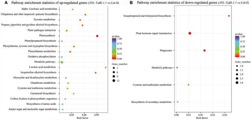 KEGG富集分析差異表達基因被呈現(xiàn)為散點圖。 使用富集因子、q值和通路中富集的基因數(shù)量來測量富集程度。 富集因子越高表示富集程度越高。觀察到上調(diào)基因富集了20多個KEGG通路。上調(diào)基因的前20個富集通路中,其中光合作用是最明顯的富集途徑(圖7A)。 光合作用的富集因子達到0.09,而q值大約為0。相反,下調(diào)基因的KEGG富集通路并不明顯,只有6個富集因子較低的通路被鑒定出來(圖7B)。因此,TaBI-1.1參與對生物脅迫的應(yīng)答并主要通過基因上調(diào)表達來執(zhí)行其防御功能。