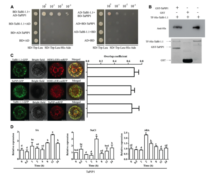 AtBI-1定位于ER膜上,研究者在小麥原生質(zhì)體中檢測了TaBI-1.1-GFP和mRFP-HDEL的共定位以確定TaBI-1.1的亞細胞定位。GFP和mRFP熒光的重疊系數(shù) 是0.69,表明TaBI-1.1與ER膜上的HDEL共定位(圖8C)。 鑒于TaBI-1.1和TaPIP1之間的相互作用,研究者還檢測到TaPIP1-GFP和mRFP-HDEL之間的共定位以及TaBI-1.1-GFP和TaPIP1-mRFP在小麥原生質(zhì)體中的共定位(圖8C)。 結(jié)果顯示TaBI-1.1和TaPIP1共定位于ER膜。