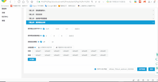 根據(jù)實驗方案設計以及樣品信息,進行分組的設置,流程據(jù)此進行差異比較分析,此處只支持兩組間比較,可添加多個差異分組。(此處的參數(shù)和差異分組在后期報告?zhèn)€性化中可再次進行修改)